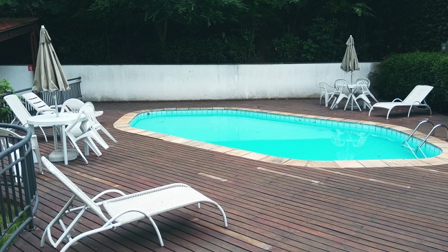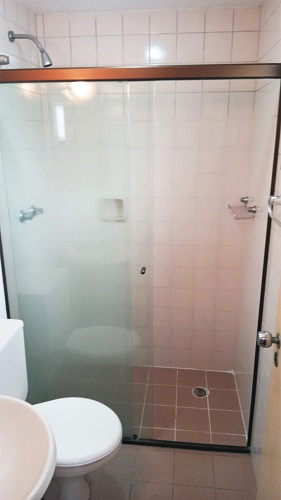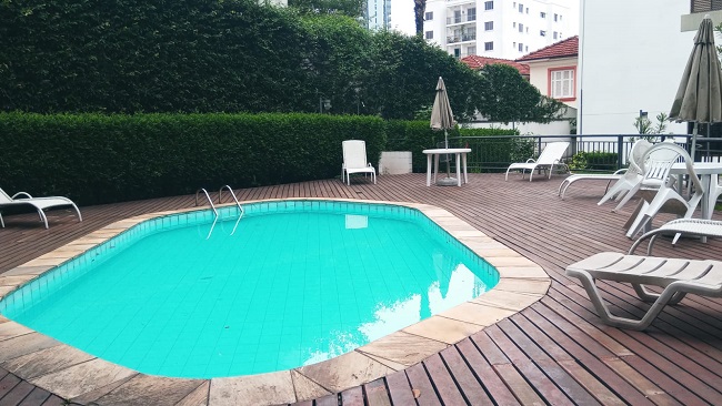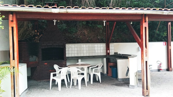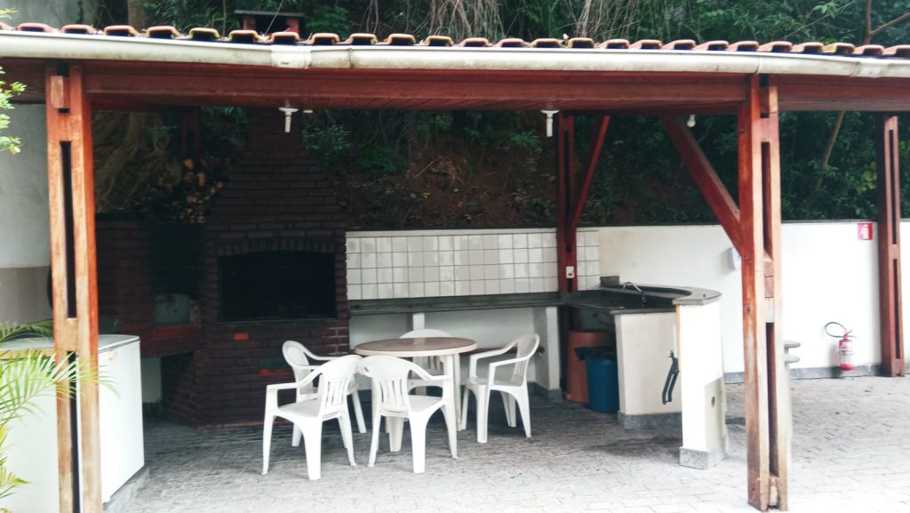 Condomínio com portaria 24 horas, piscina e salão de festas.