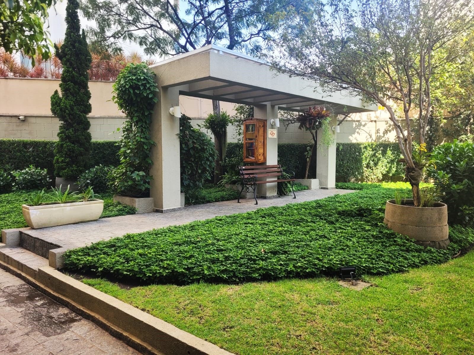 Condomínio com diversas áreas ajardinadas com banco para leitura ou para mero descanso, piscina recreativa, piscina aquecida e coberta, salão de jogos, academia de ginástica completa, mini-mercado, salão de festas, espaço churrasqueira, quadra esportiva e sauna.
