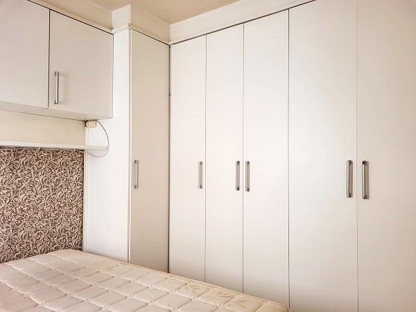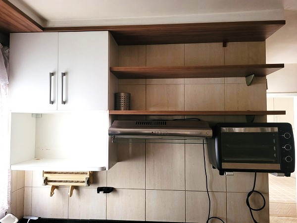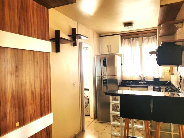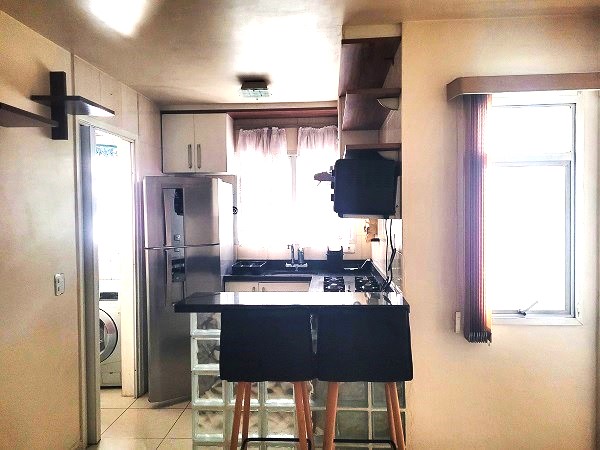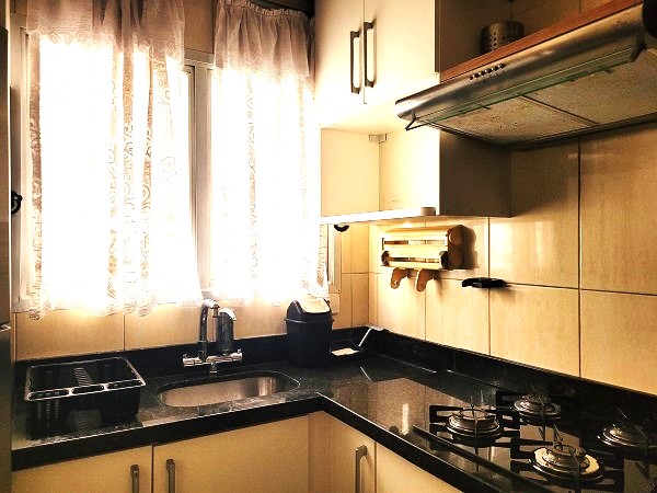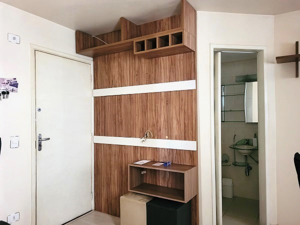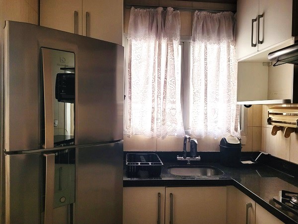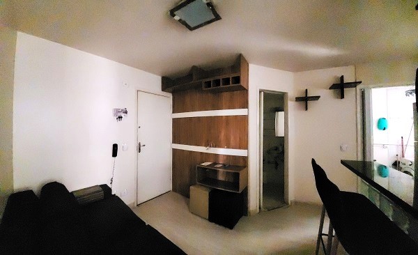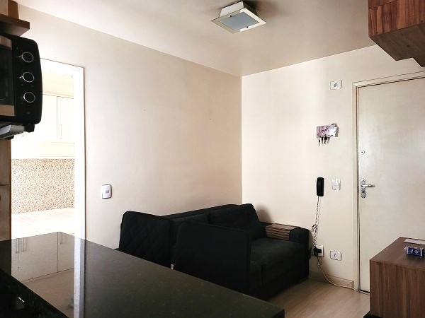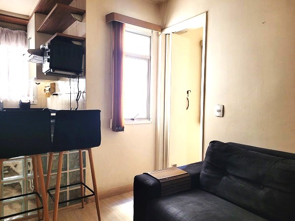 Apartamento da década de 90, construtora CYRELA, 28m2 de área útil, 01 dormitório com cama e armário ao longo de toda parede,, cozinha americana com bancada em granito preto, geladeira, fogão 4 bocas tipo cooktop e armários planejados. Sala com sofá de 2 lugares e painel de parede em MDF para instalação de TV. Área de serviço com tanque de lavar roupa e máquina de lavar roupa.