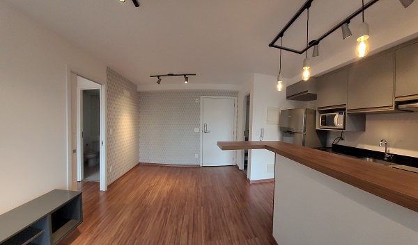 Apartamento NOVO, 44 m2 de área útil com uma suíte, ar condicionado ( tipo INVERTER), armário sob medida em MDF, acesso à varanda e banheiro com box em vidro, gabinete de pia e aquecimento central. Tudo planejado para garantir o maior conforto possível. Iluminação de todo apartamento com lâmpadas LED e luminárias que permitem o redirecionamento das luzes. Área de piso da sala e suíte revestidos com laminado de primeira linha em meio tom. Sala com mesa balcão em madeira maciça na cor clara, sob o qual foi instalado armário de duas portas voltado para a cozinha com espaço para copos, galeteiro, entre outras pequenos itens de cozinha; através da sala temos ainda acesso à varanda onde o guarda corpo possui duas peças deslizantes ao longo de toda varanda ( envidraçada ) em metal que servem de proteção para o sol, tanque de lavar roupa em cerâmica preta e armário pequeno ao lado e espaço suficientes para acomodar mesa e cadeiras.