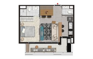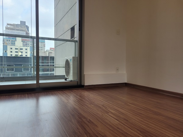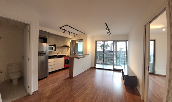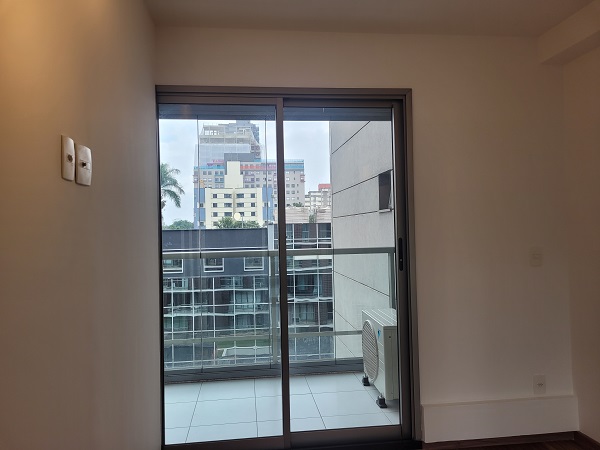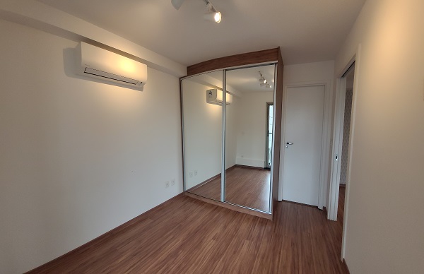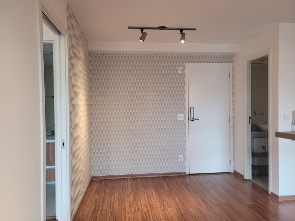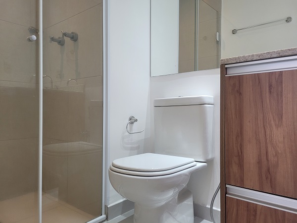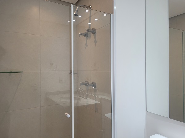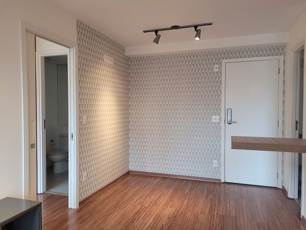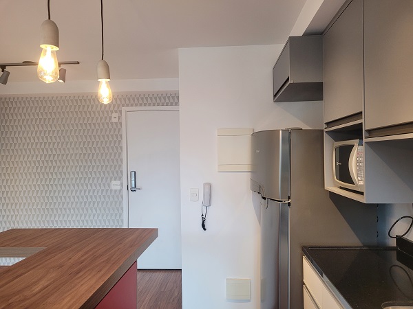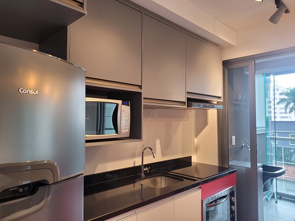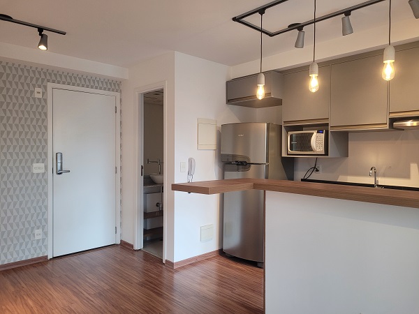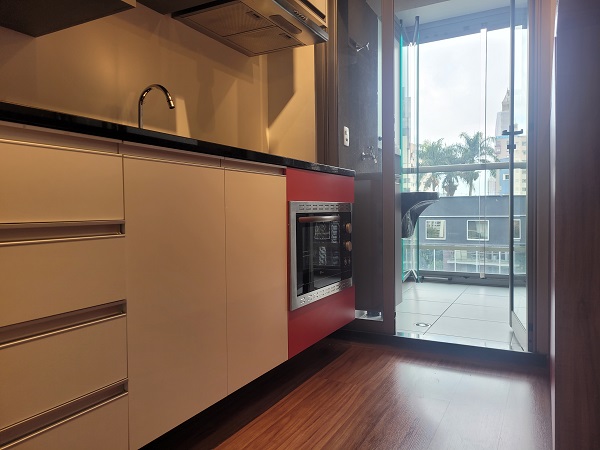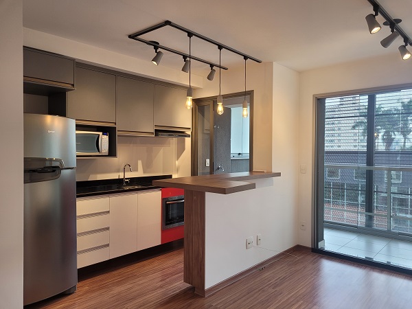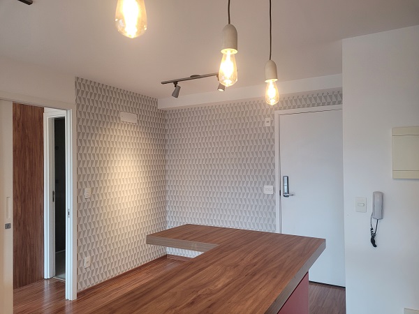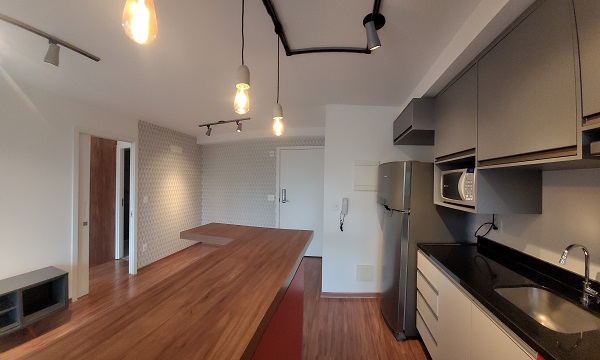 Apartamento NOVO, 44 m2 de área útil com uma suíte, ar condicionado ( tipo INVERTER), armário sob medida em MDF, acesso à varanda e banheiro com box em vidro, gabinete de pia e aquecimento central. Tudo planejado para garantir o maior conforto possível. Iluminação de todo apartamento com lâmpadas LED e luminárias que permitem o redirecionamento das luzes. Área de piso da sala e suíte revestidos com laminado de primeira linha em meio tom. Sala com mesa balcão em madeira maciça na cor clara, sob o qual foi instalado armário de duas portas voltado para a cozinha com espaço para copos, galeteiro, entre outras pequenos itens de cozinha; através da sala temos ainda acesso à varanda onde o guarda corpo possui duas peças deslizantes ao longo de toda varanda ( envidraçada ) em metal que servem de proteção para o sol, tanque de lavar roupa em cerâmica preta e armário pequeno ao lado e espaço suficientes para acomodar mesa e cadeiras.