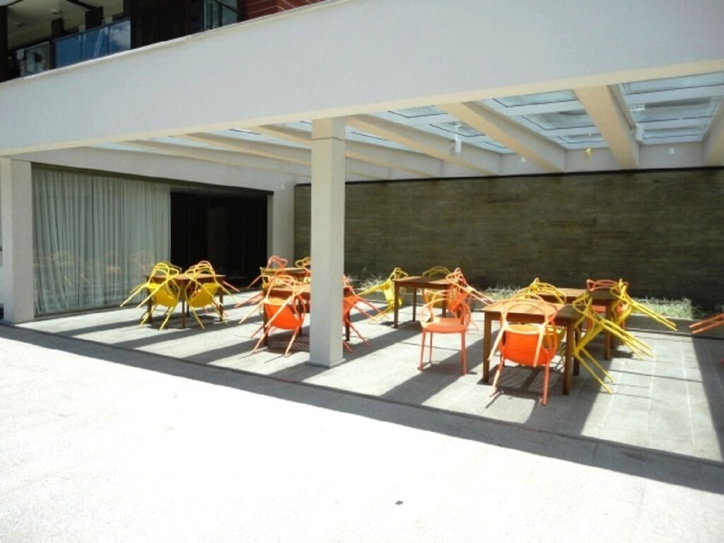 Condomínio que oferece piscina, sala de ginástica equipada, salão de festas com cozinha equipada, espaço gourmet e lavanderia, além de ter um mini mercado para compra local.