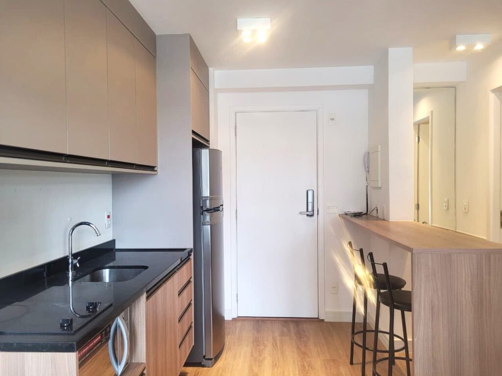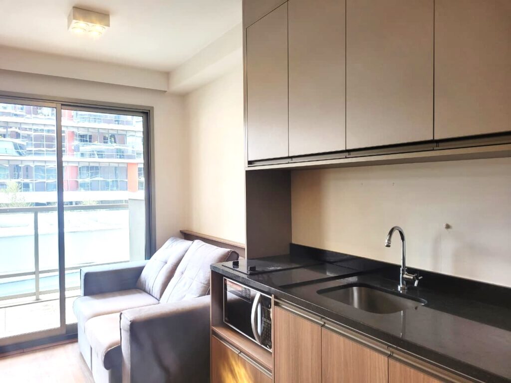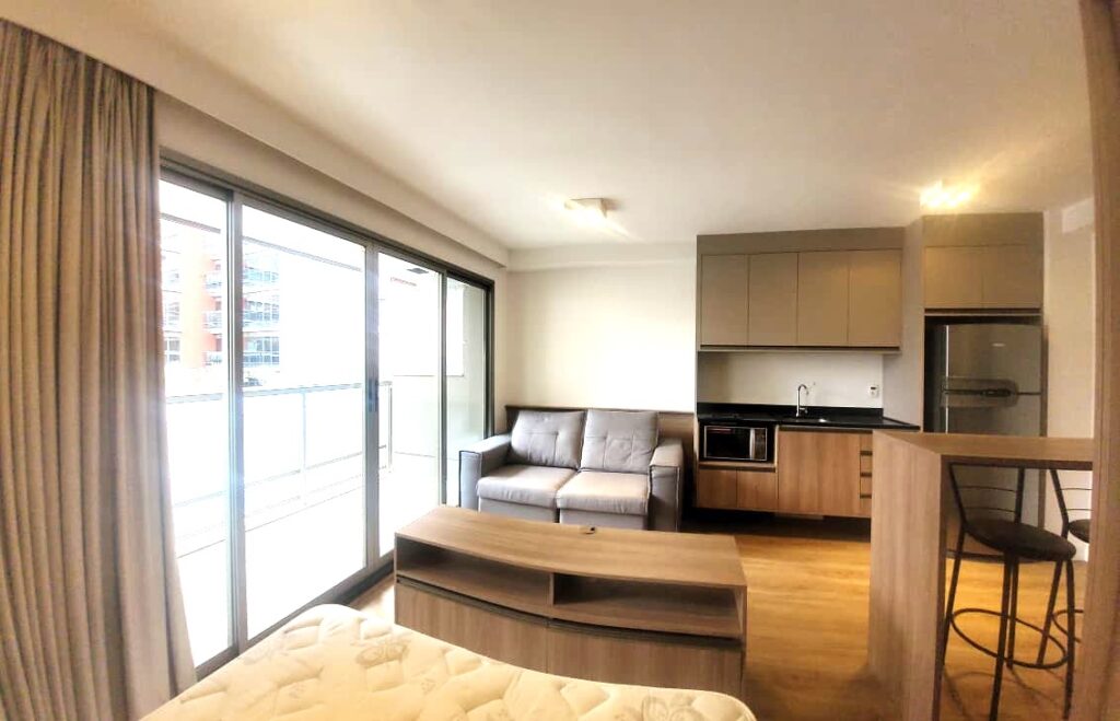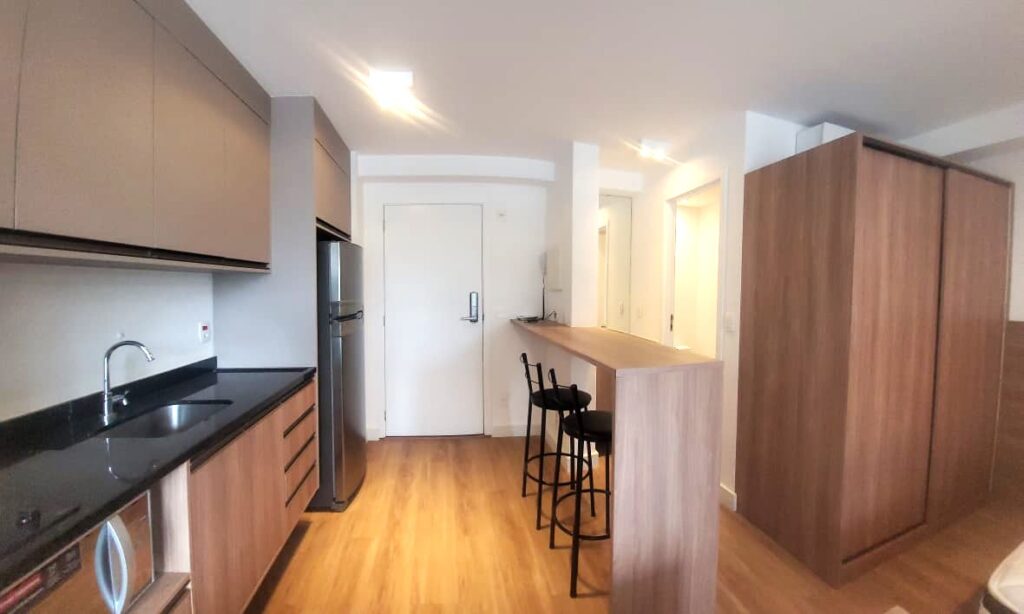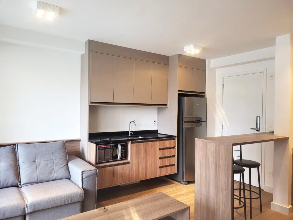 Apartamento da década de 2010, apenas 9 anos de construção, 31 m2 de área útil em 01 dormitório com cama de casal e armário em MDF, ar condicionado, banheiro com box em vidro temperado e lavatório externo. Cozinha tipo americana com armários planejados, cooktopo 2 bocas, microondas e geladeira em inox, tudo em ótimo estado de conservação. Piso do apartamento revestido com laminado e varanda espaçosa com porta balcão e brisê para proteção do sol. O apartamento possui 01 vaga de garagem em local indeterminado.