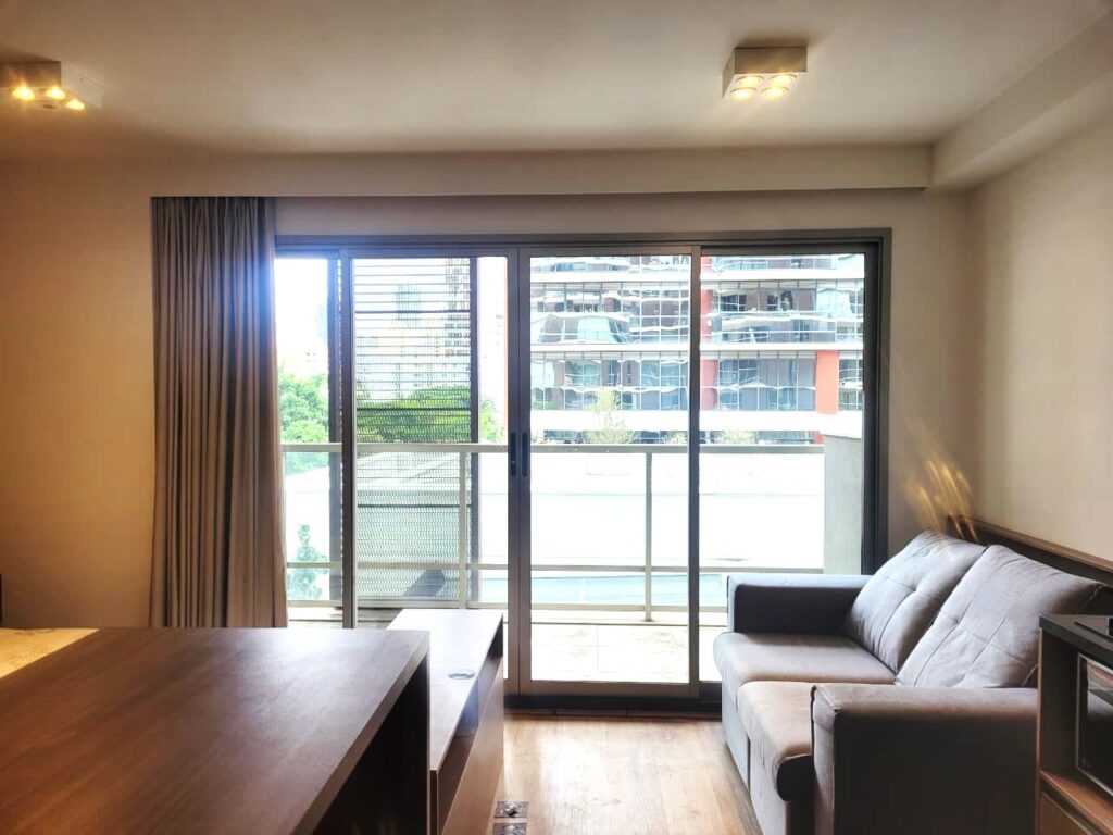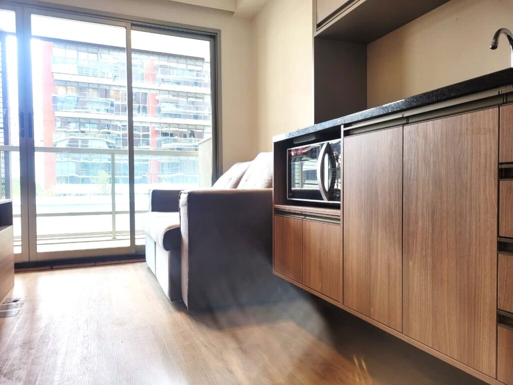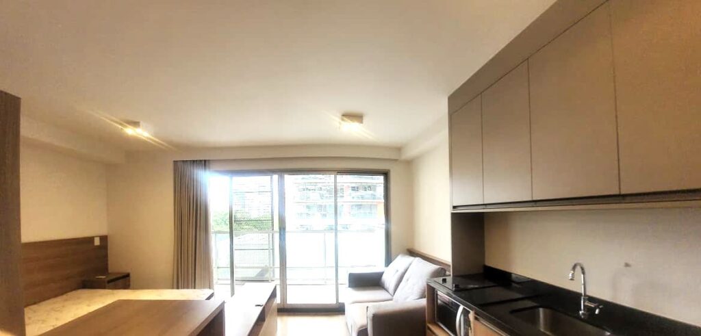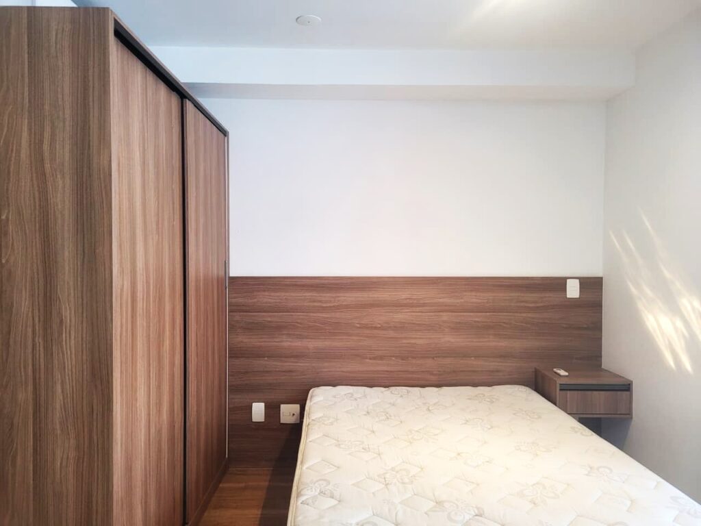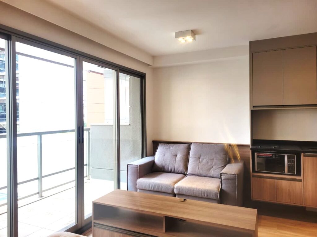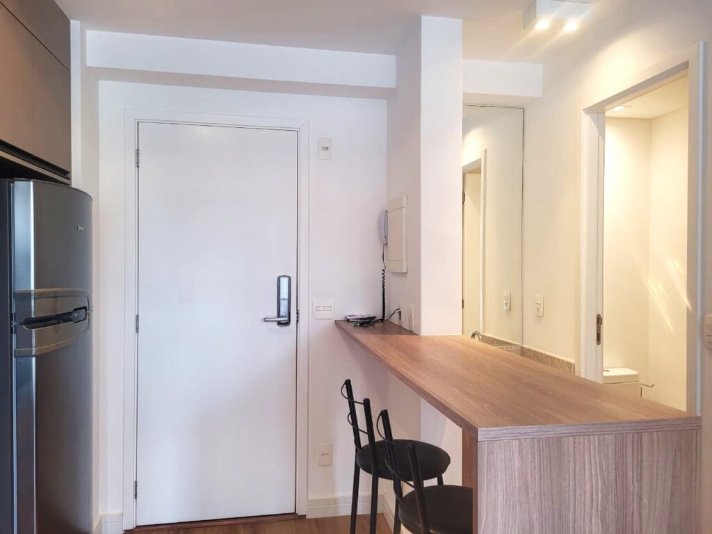 Apartamento da década de 2010, apenas 9 anos de construção, 31 m2 de área útil em 01 dormitório com cama de casal e armário em MDF, ar condicionado, banheiro com box em vidro temperado e lavatório externo. Cozinha tipo americana com armários planejados, cooktopo 2 bocas, microondas e geladeira em inox, tudo em ótimo estado de conservação. Piso do apartamento revestido com laminado e varanda espaçosa com porta balcão e brisê para proteção do sol. O apartamento possui 01 vaga de garagem em local indeterminado.