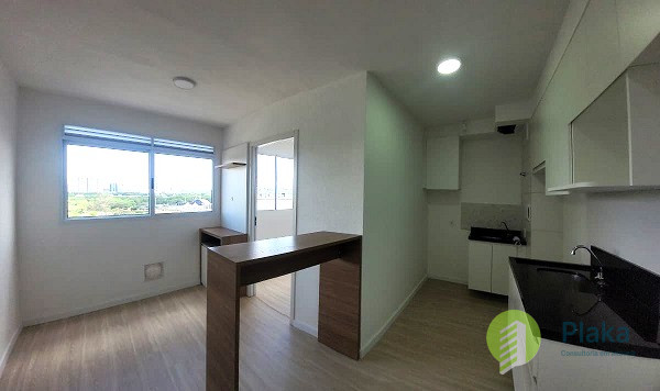 Apartamento NOVO, primeira locação, um ano de construção, 32m2 de área útil com 2 dormitórios, ambos com armários sob medida em MDF e piso revestido com laminado. Sala com mesa balcão e painel para TV. Cozinha e área de serviço com armários sob medida em MDF. Banheiro com pia em granito e gabinete, além de box em vidro temperado incolor. O apartamento NÃO POSSUI VAGA DE GARAGEM.