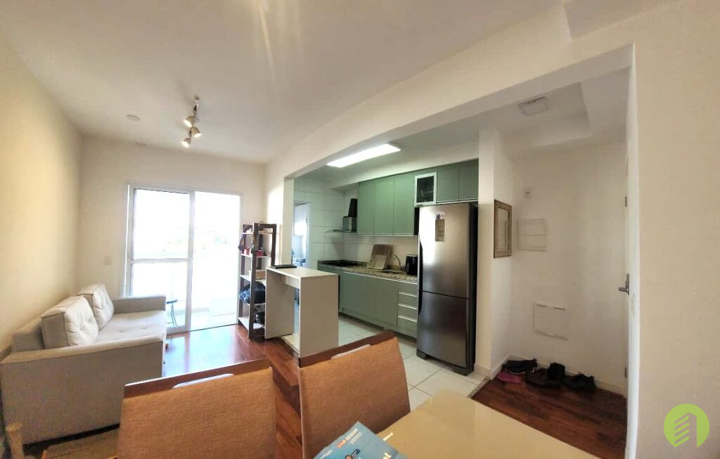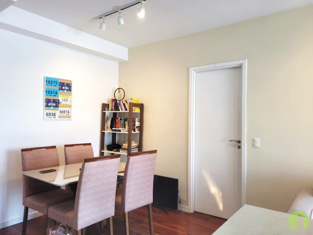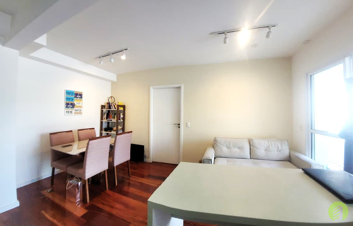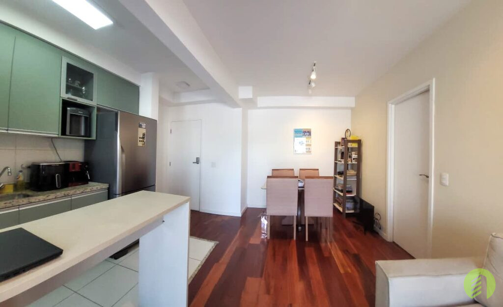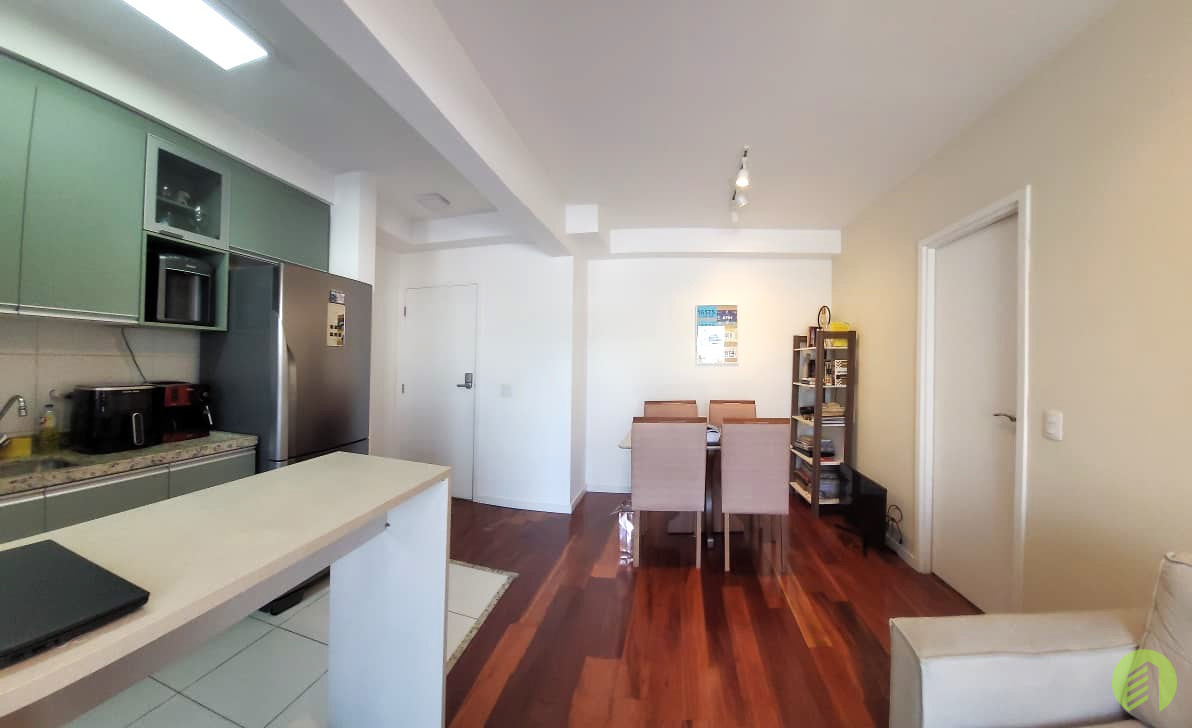 Apartamento da década de 2010, com 10 anos de construção, possui 45m2 de área útil distribuídos em um dormitório tipo suíte com piso revestido com tacos de madeira e janela que permite ótima iluminação natural. Banheiro com box em vidro temperado e aquecimento à gás, Sala com ambiente para TV e outro com mesa de jantar, e ainda oferece uma bela varanda. Cozinha americana com fogão tipo cooktop, forno elétrico e filtro d'água, tudo em ótimo estado de conservação. Área de serviço com espaço suficiente para máquina de lavar roupa e varal, boa ventilação local. O apartamento possui 1 vaga de garagem em local indeterminado.