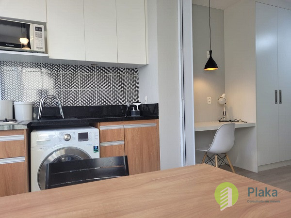 Apartamento com estilo moderno, 30m2 de área útil distribuídos em 01 dormitório com cama de casal, TV, armário embutido e piso revestido com laminado. Banheiro com box em vidro e aquecimento de água central. nicho com mesa e iluminação para uso como home office e logo na entrada do apartamento temos armário e prateleiras nas laterais e finalmente a varanda que serve de sala e cozinha americana com mesa para 4 lugares, com cadeiras, frigo-bar, microondas, cooktop de duas bocas, máquina de lavar, varal retrátil e armário de parede. A varanda é totalmente envidraçada e silenciosa. o apartamento possui 01 vaga de garagem.