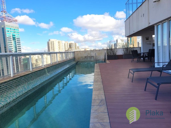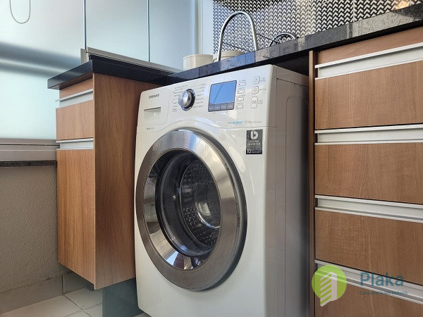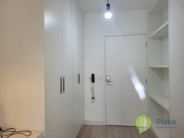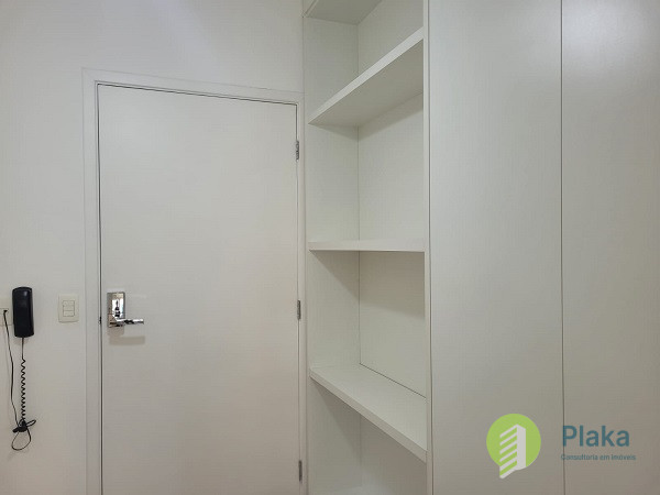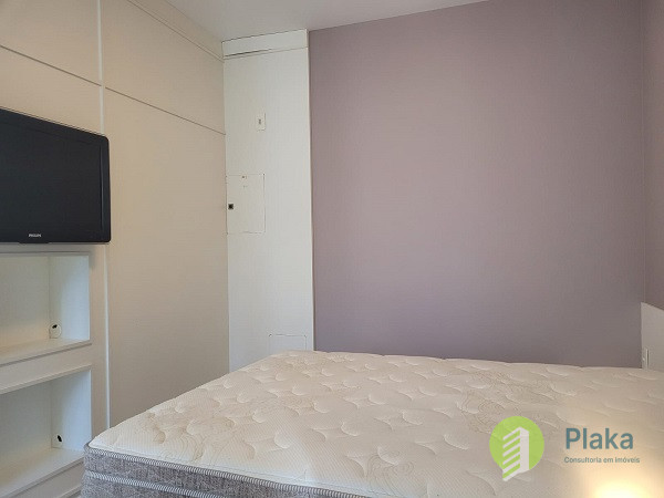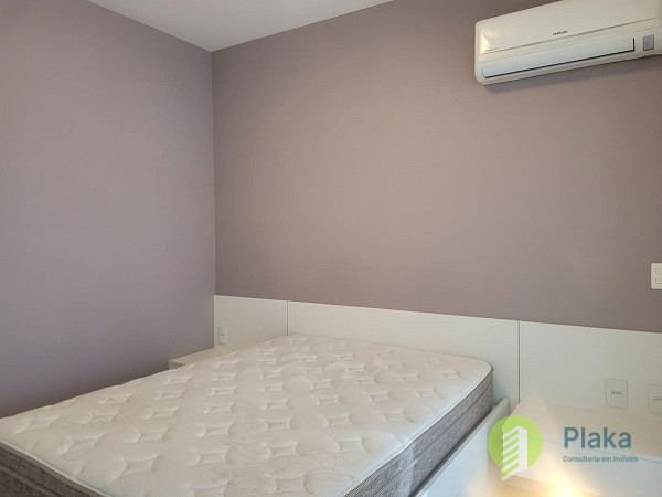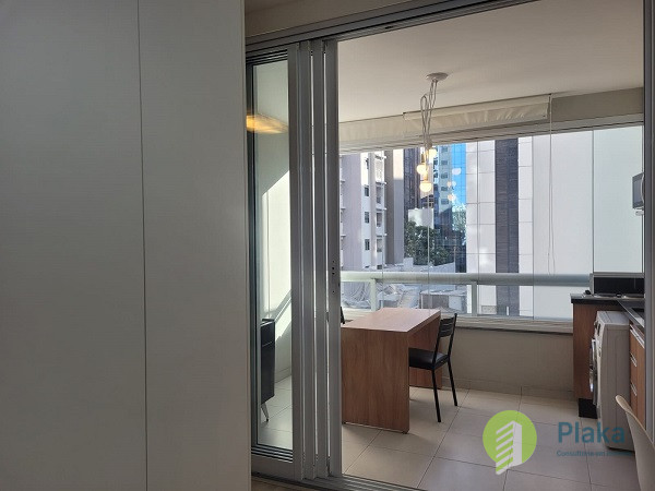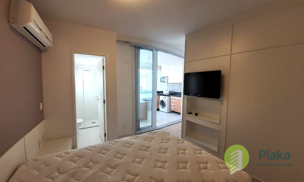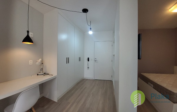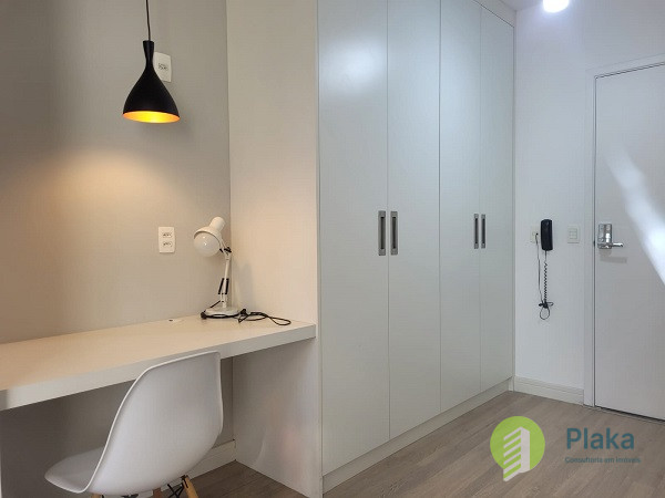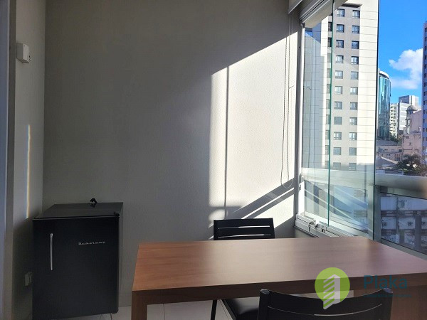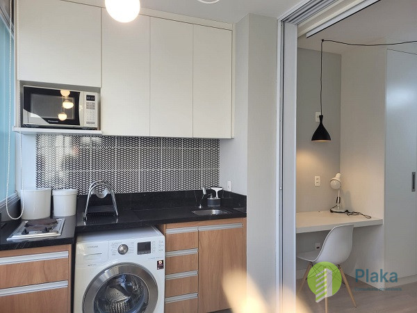 Apartamento com estilo moderno, 30m2 de área útil distribuídos em 01 dormitório com cama de casal, TV, armário embutido e piso revestido com laminado. Banheiro com box em vidro e aquecimento de água central. nicho com mesa e iluminação para uso como home office e logo na entrada do apartamento temos armário e prateleiras nas laterais e finalmente a varanda que serve de sala e cozinha americana com mesa para 4 lugares, com cadeiras, frigo-bar, microondas, cooktop de duas bocas, máquina de lavar, varal retrátil e armário de parede. A varanda é totalmente envidraçada e silenciosa. o apartamento possui 01 vaga de garagem.